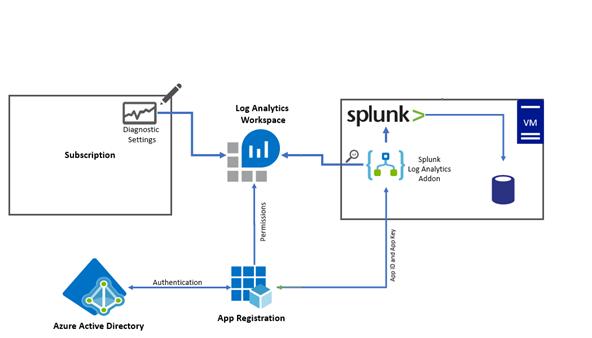 The Splunk Add-on in Splunk would need the APP registration ID and key to connect to log analytics and pick the logs directly from the Log Analytics workspace. The same App registration details can be used by the Python/Powershell scripts running in an Azure function if needed to make rest API calls to fetch the logs.