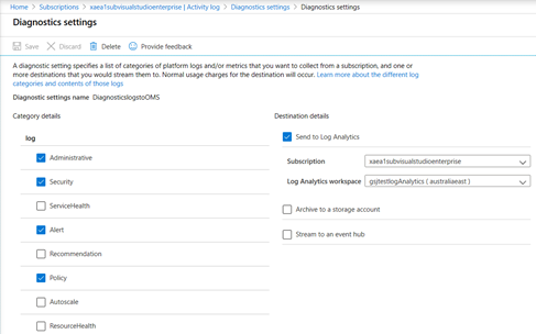 Below screenshot shows diagnostic settings for subscriptions can be setup to send events to the log analytics workspace. The process is identical for Azure resources and AAD. We can use Azure policies to enforce diagnostic settings to be integrated with log analytics workspace automatically. A remediation policy can add the diagnostic setting to applicable resources. We can enforce and deploy OMS Extensions to Azure VM’s to ensure System and application logs are sent to log analytics workspace from Windows VM’s and Syslogs incase of Linux. There are built-in Azure policies available in Azure that can install the extension as soon as a new VM is deployed or remediate existing VM’s by installing the extension automatically.