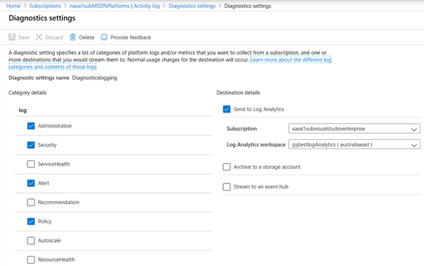 We need to create a log analytics workspace that would be used to point diagnostic settings from Azure resources, subscriptions, AAD. You can easily manage retention log policies and alerts for log analytics workspaces. The log analytics workspace is a very versatile, highly available, scalable and reliable solution which requires very little administrative effort once setup.