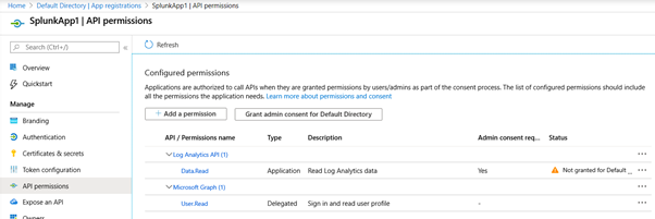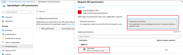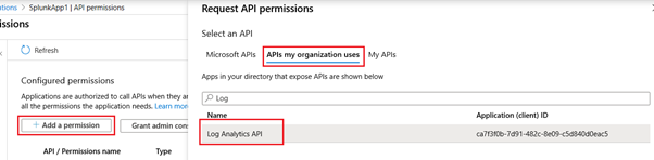 The App registration is done with the following permissions. This can be done by clicking “Add a permission”, click “API my organization uses” and then search and select the “Log Analytics API”, expand “API permissions” and check the box for “Data.Read”.