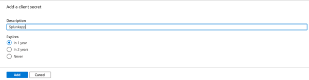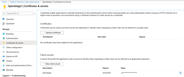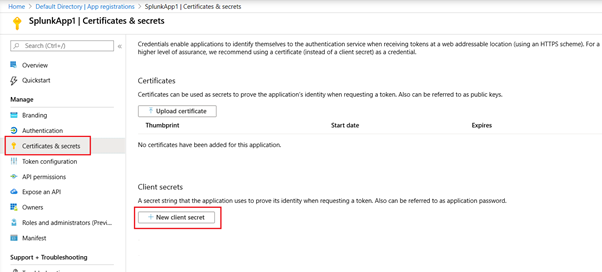 The App secret needs to be created to allow it to be used as a password for the app registration. To create an app secret, click “Certificates & Secrets”, then “New client secret”.
