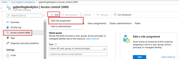 We need to allow the app id with its secret to be able to talk to log analytics. Once again for this purpose we will allocate the minimum required permissions for the APP on log analytics workspace. For this we will need to revisit the log analytics workspace and setup the IAM roles. Click the “Access Control (IAM)” on the log analytics workspace and then click “Add” and then “Add role assignment”