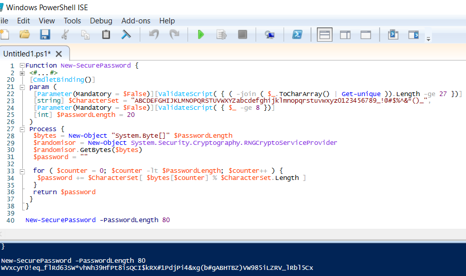 For this Excercise I used an existing Azure VM with Windows 2016. Since Get-random is not considered secure, static code analysis tools flag it as a concern so I used an RNG crypto based password. I used an 80 character password. You can see my code for the same at https://github.com/jutlag/CommonFunctions/blob/master/New-SecurePassword.ps1