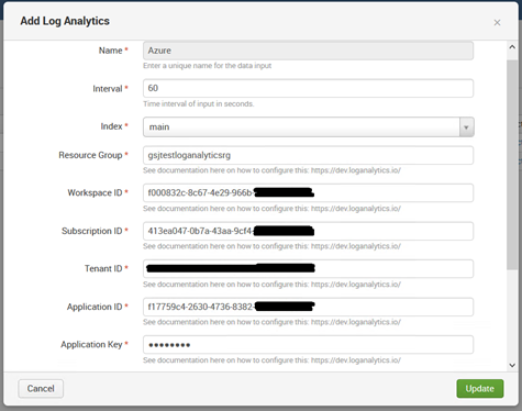 Input the details for the Log analytics workspace where you want the Splunk add on to connect to and fetch the logs.