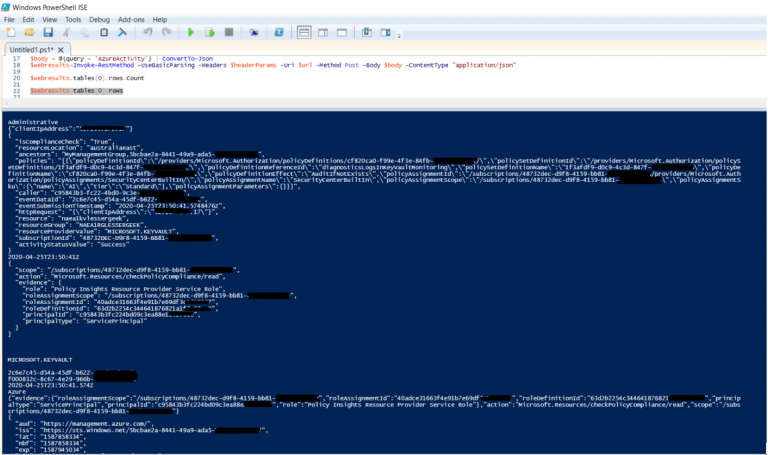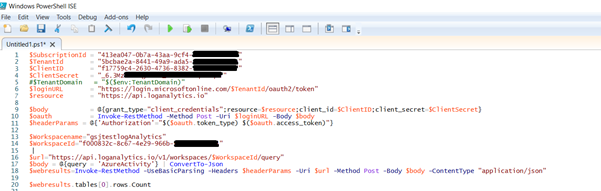 We may have a use case where Azure function needs to fetch the events from the event logs and then send them to one or more splunk instances after processing. This can be easily done as well. The following code sample was used to fetch the Log analytics events. For this exercise I am simply listing the results after fetching the events. I will skip the creation of Azure function and simply demonstrate the code in powershell ISE. There are code samples available for Python and .NET. The demonstration below uses the powershell code.