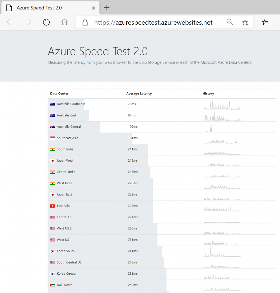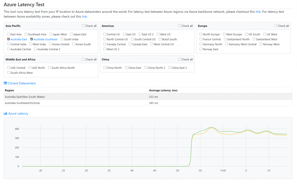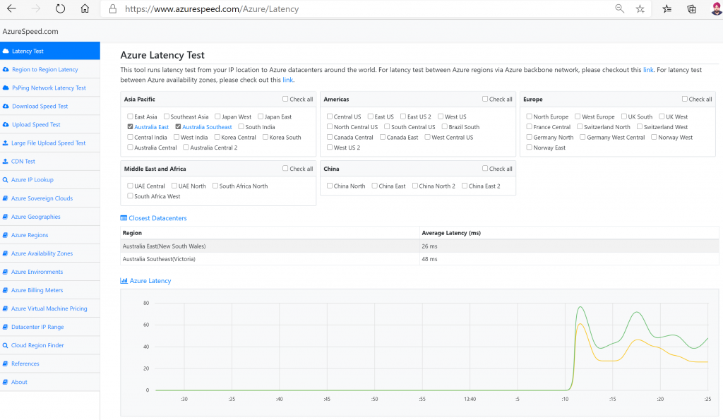 AzureSpeed.Com will let you select Azure Regions and show you the latency for all the regions from your current location based on your IP address. As shown in the screenshot below I have selected 2 regions “Australia East” and “Australia SouthEast”. AzureSpeed.Com tests latency between my IP address and the selected regions. This is a real-time latency test.