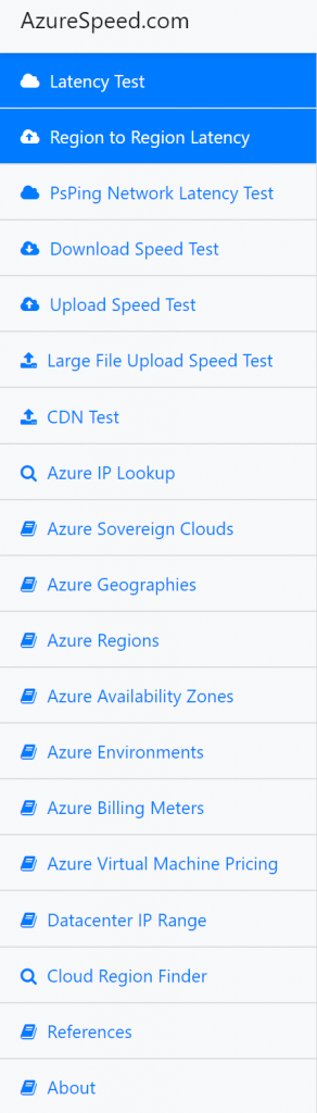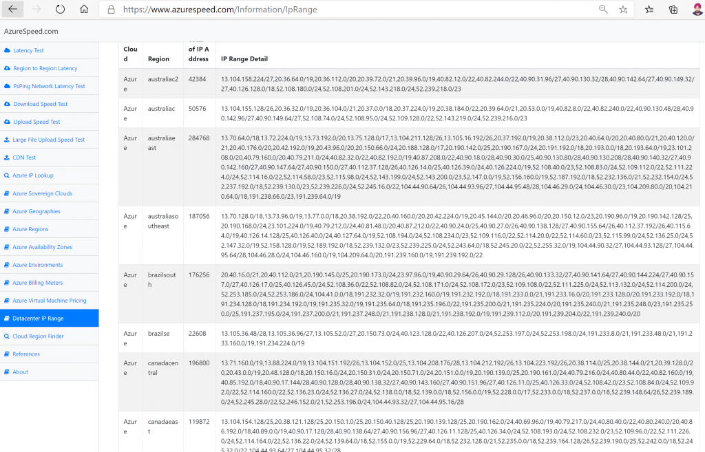 This is one of the most interesting feature that was very helpful for me while working with Azure resources. I needed a complete list of IP addresses for a region for a very specific security and networking related requirement and AzureSpeed.Com readily had this most updated list