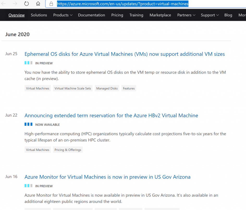 I clicked on the first item under compute i.e. “Virtual machines” and it to shows the RSS feed for the changes that happened in Azure related to the virtual machines.