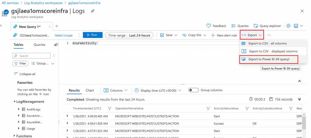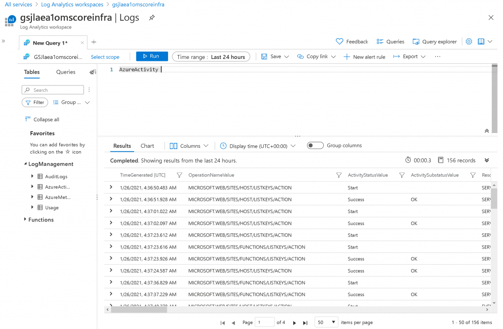 Step 1: Verify you have some logs captured and ensure they are visible within a log analytics workspace. Run a Kusto query as shown below and you should be able to see the logs. you may want to limit the queries to last 24 hours otherwise the query might take too long to refresh and the dataset being fetched will keep increasing every day depending upon the data retention set on your log analytics workspace. To limit the query to last 24 hours the sample query would be