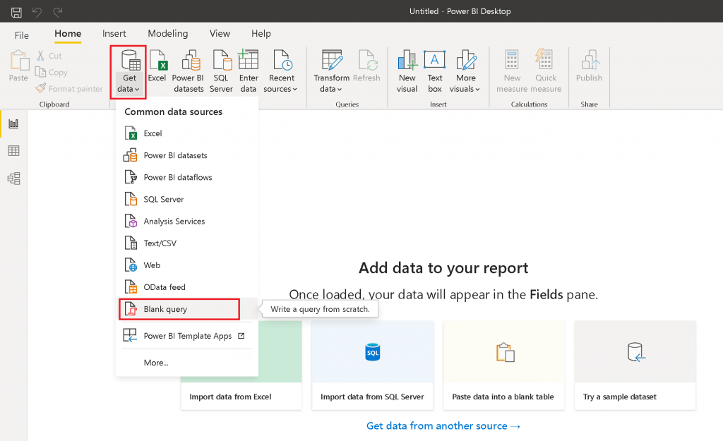 Step 4: Launch the Power BI desktop and open the query as shown below. Click the “Get Data” button and choose “Blank Query”. In the next step we will use the query exported in step 3.