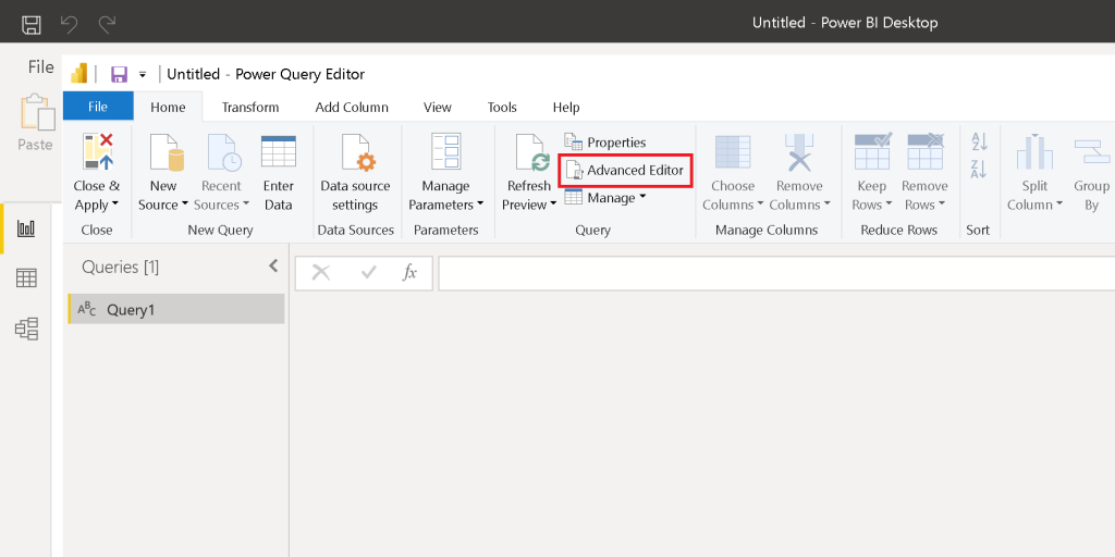 2) In Power BI Desktop select: 'Get Data' -> 'Blank Query'->'Advanced Query Editor'