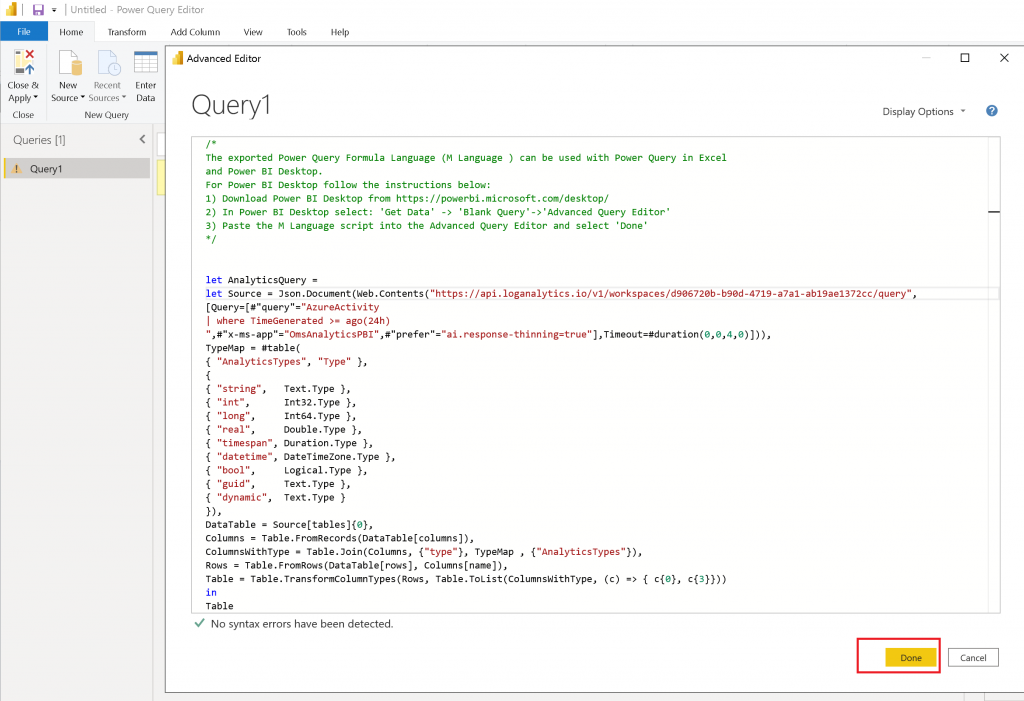 3) Paste the M Language script into the Advanced Query Editor and select 'Done'