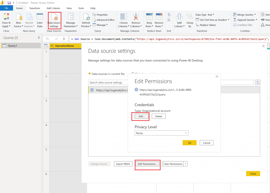 Step 6: At this stage you might have to login to the organization account with credentials that have permissions to read the data from the log analytics workspace. If you see any errors, click the “Data Source Settings” -> “Edit Permissions” and then “Edit Permissions”.