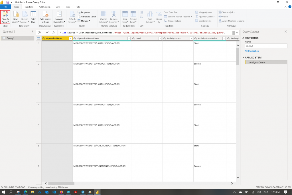 Step 7: If all goes well, you should be able to see the same dataset that was visible in Log analytics workspace. You can at this stage either change the column names by right clicking them and renaming them. You may want to remove columns you don’t need. Alternatively from within the Log analytics workspace you can use the project and extend to rename or select the columns you need to build your reports. Please note that any columns you rename or limit within the log analytics query will make the fetching reports slightly quicker as the data is received in Power BI preformatted. You should see the data as indicated in the below screenshot