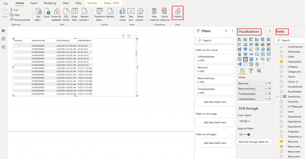 Step 9: You can drag drop fields, adjust the visualizations as you do in any Power BI report. Once you are ready to publish the report, Save the report and click “Publish”