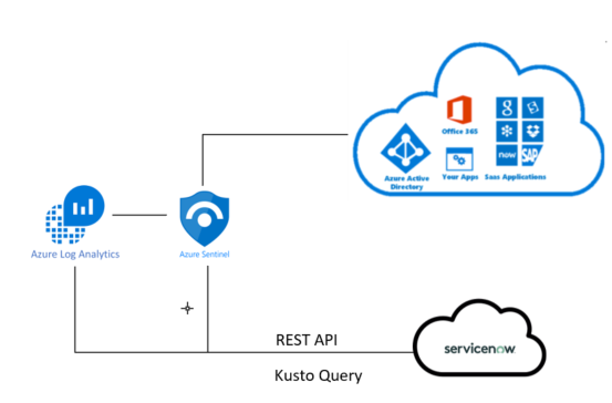 To make ServiceNow and Sentinel Integration easier we thought of using REST API and allow ServiceNow to directly interact with Azure Sentinel and Log analytics workspace. Fetching data from Log Analytics Workspace using Kusto query is fairly easy and very well documented. It can be used for fetching security incident and alert data as well as other information for building reports. The part that is not well documented as of now is the process to use REST API within ServiceNow. The connectivity will be as shown in the below diagram