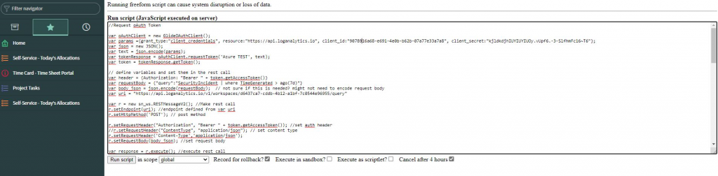 Here is the fully functional Powershell code. I will explain later in this article how to do the same thing within ServiceNow. The Azure Application or the client id can be created to provide just enough read only access to pull data and do resource discovery from Azure. There is a resource discovery capability available out of the box for ServiceNow to discover resources in Azure. The same clientID and Secret used for the capability can be used for the below script. (Note: The Client ID’s, Secrets, tenant ID, Subscription ID, Workspace ID’s are all fake so do not test the code with these. Insert details for your own environment for testing)